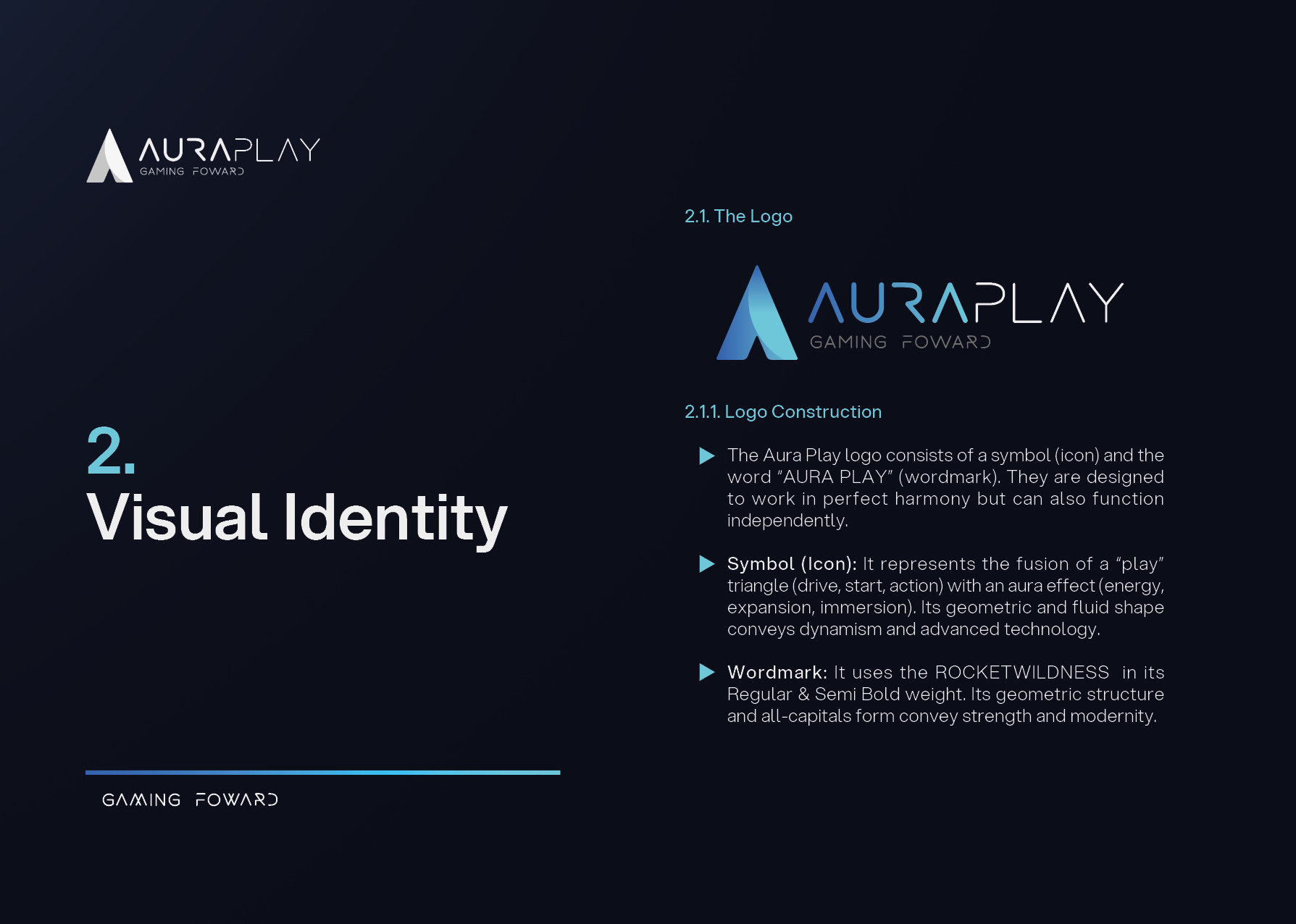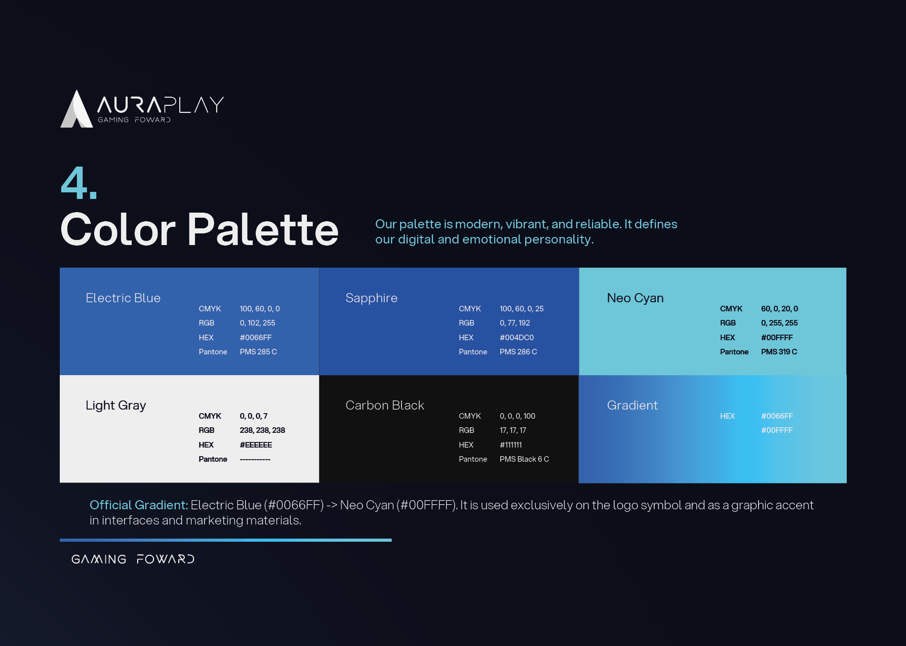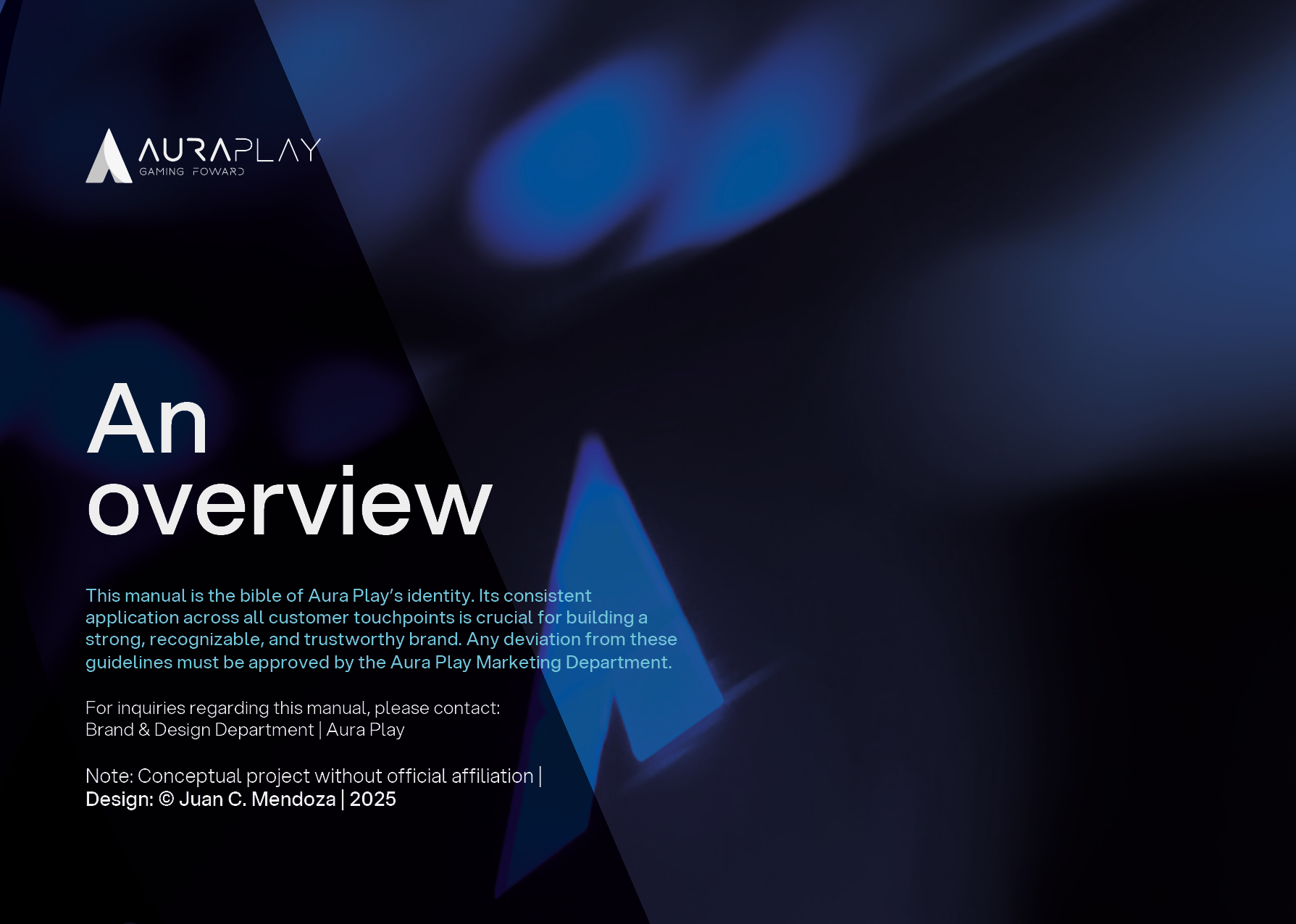 Este proyecto consistió en la creación de un sistema de identidad de marca completo y estratégico para Aura Play, una marca ficticia de entretenimiento interactivo. El objetivo era posicionarla como una líder innovadora y accesible en el sector gaming, con el eslogan rector «Gaming Forward».