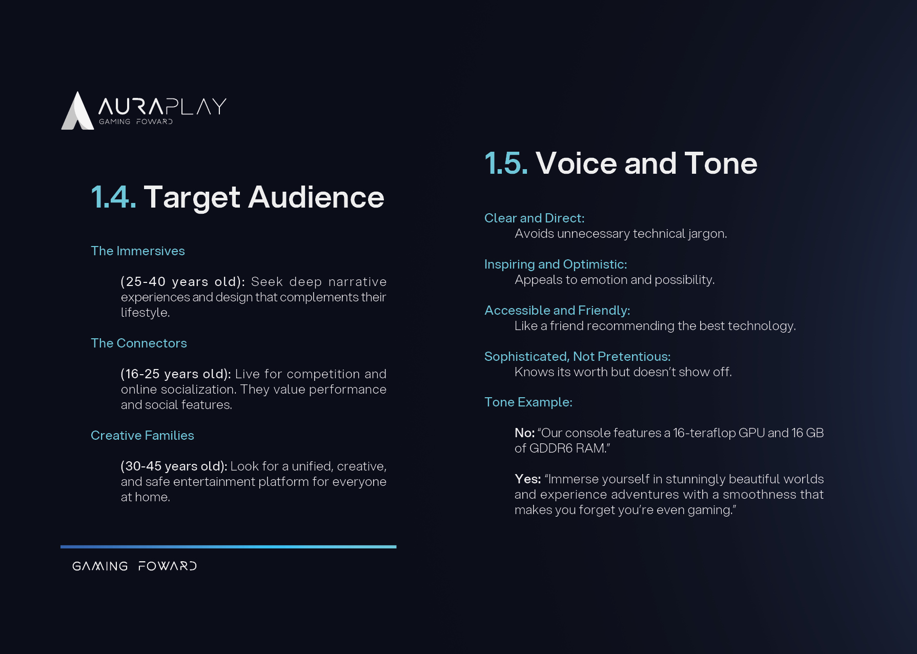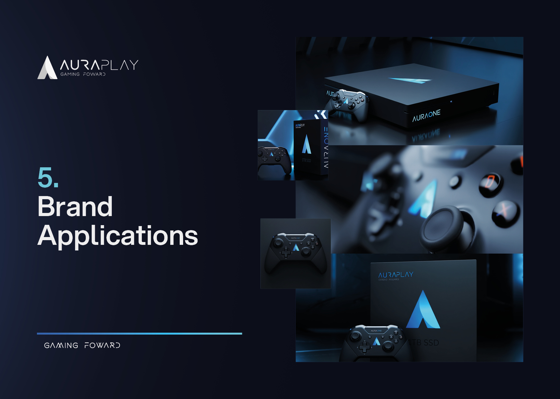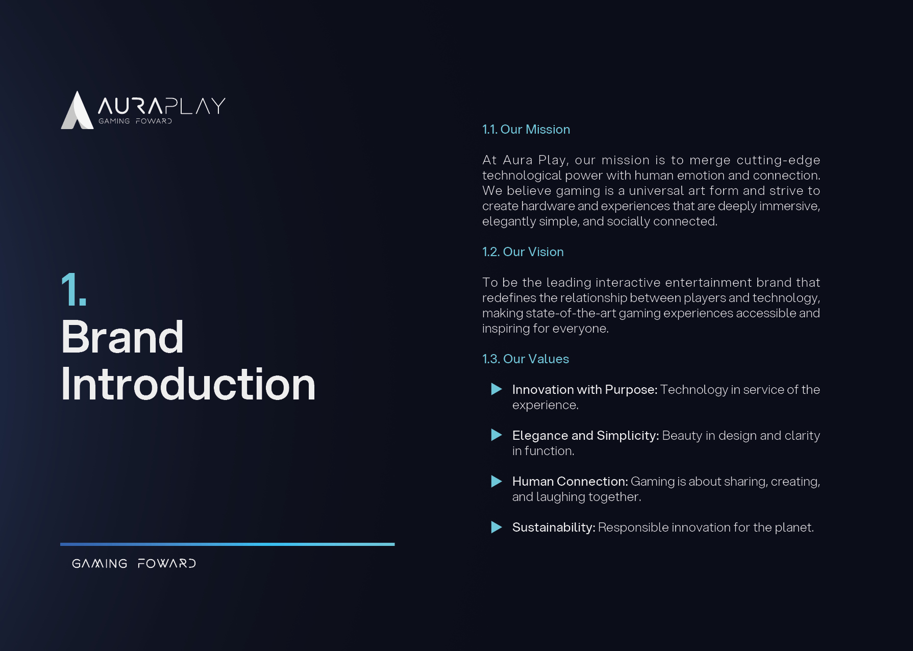 Este proyecto consistió en la creación de un sistema de identidad de marca completo y estratégico para Aura Play, una marca ficticia de entretenimiento interactivo. El objetivo era posicionarla como una líder innovadora y accesible en el sector gaming, con el eslogan rector «Gaming Forward».
