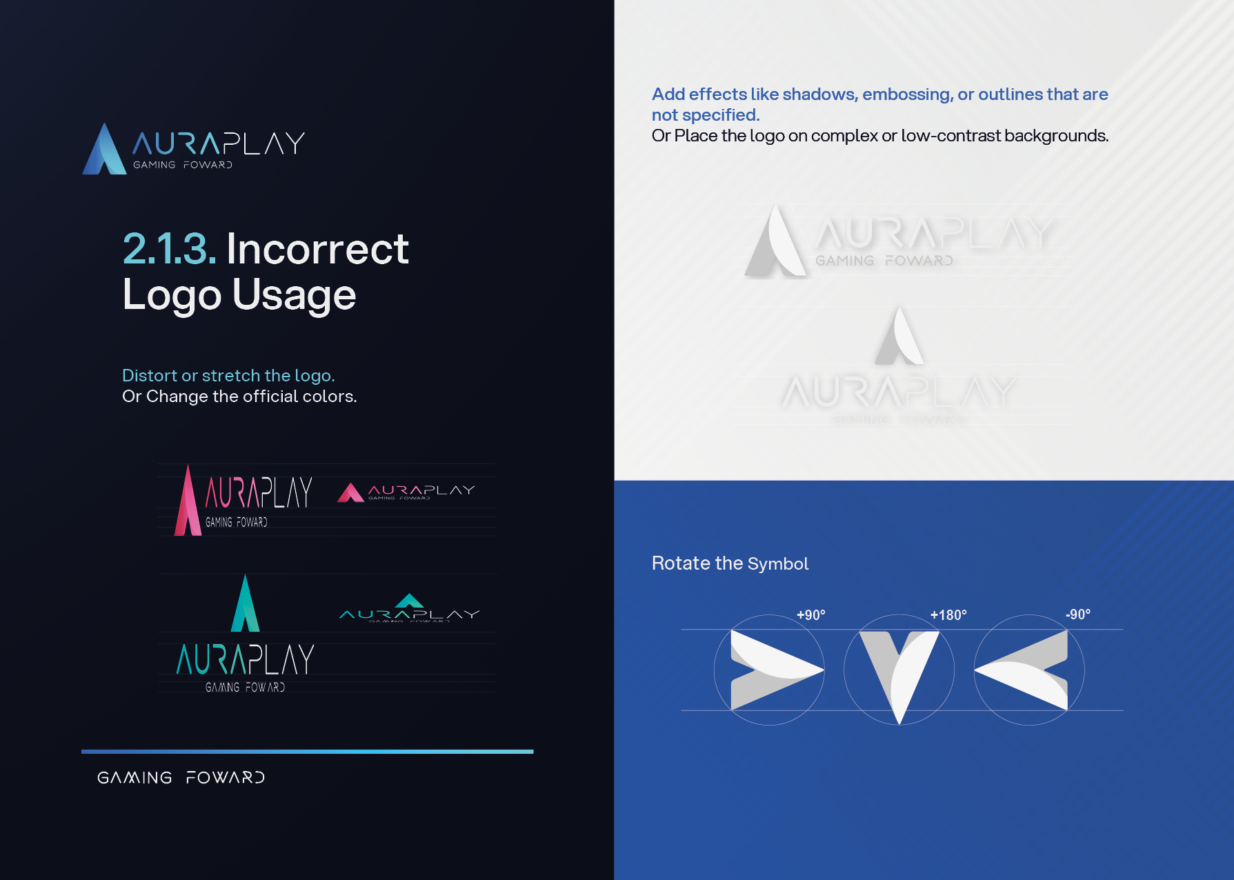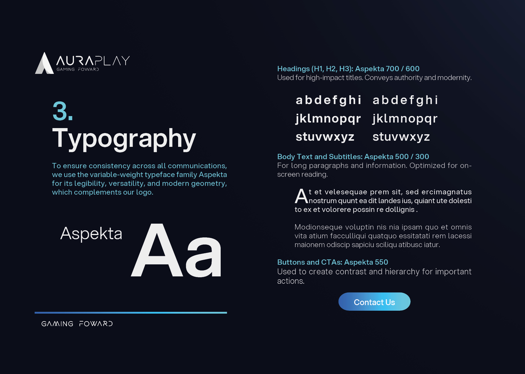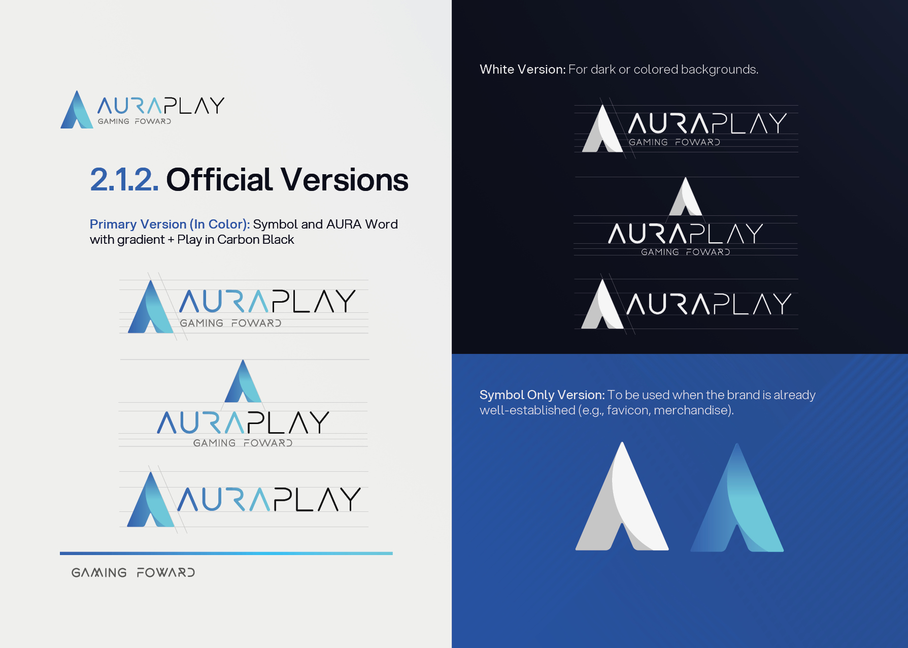 Logo: Se creó un logotipo versátil que combina un símbolo de «triángulo de play» con un efecto de «aura», representando acción e inmersión. Se definieron versiones primarias, en blanco y de solo símbolo, junto con pautas estrictas de uso para proteger su integridad.