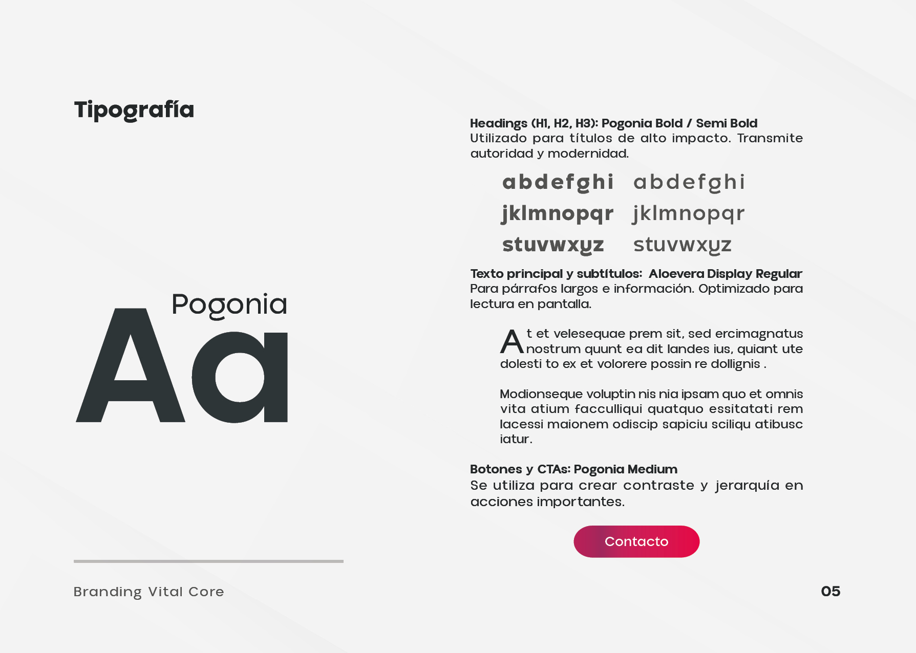 Tipografía: Pogonia (impacto y autoridad) + Alovevera Display (cercanía y elegancia).